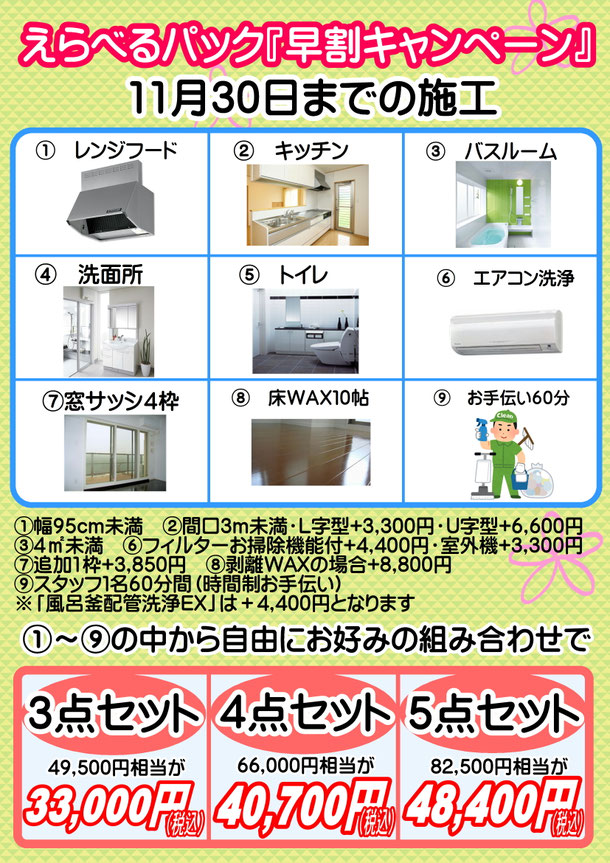 お掃除のご希望箇所を3点からお好きにえらべるお得なパック料金!